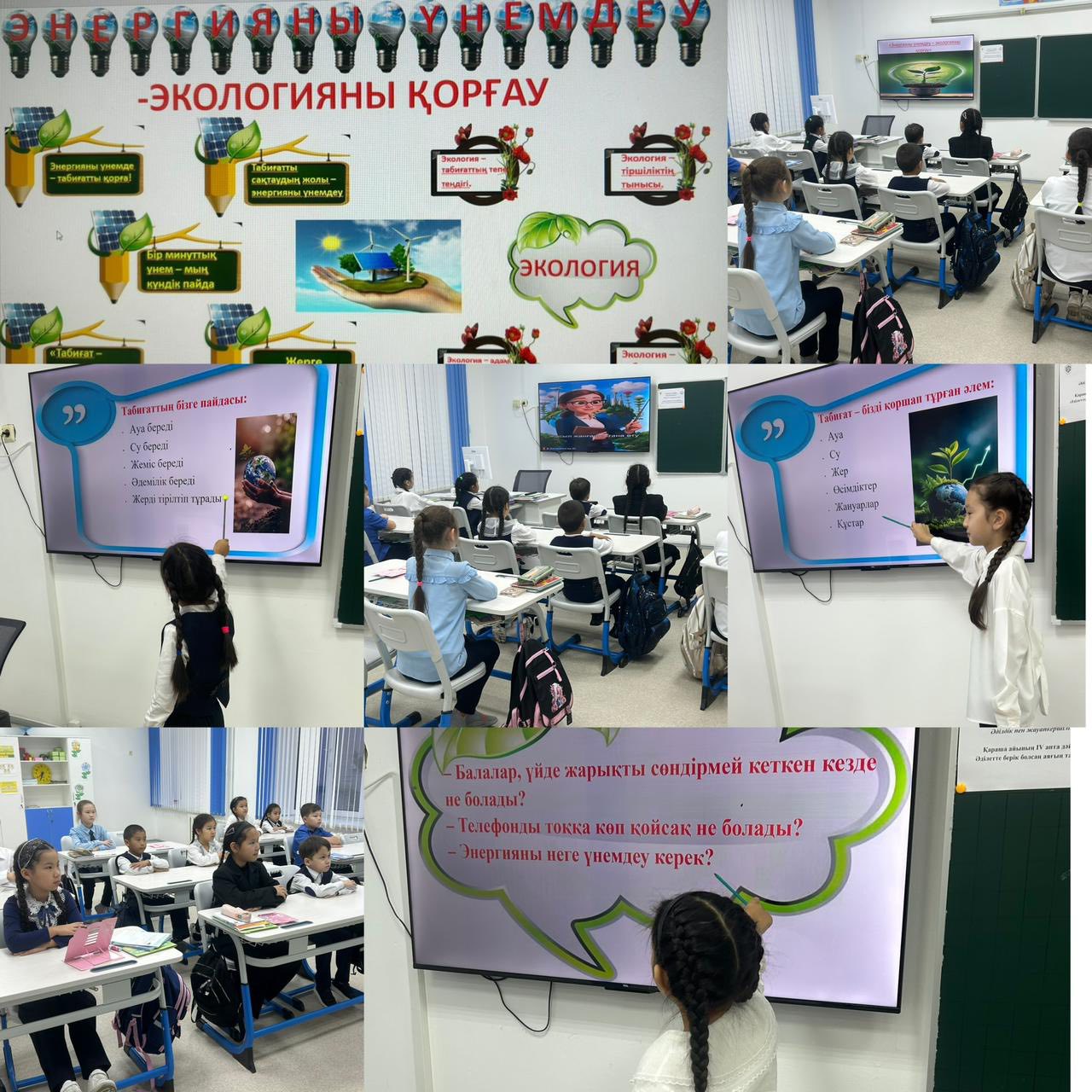 Мектебімізде «Адал азамат» біртұтас тәрбие бағдарламасының «Әділдік және Жауапкершілік» айына арналған 4-апталық жоспарына сәйкес, Халықаралық энергия үнемдеу күніне орай, 4–8 сыныптар арасында «Энергияны үнемдеу – экологияны қорғау» тақырыбында сынып сағаттары өткізілді. Сынып сағаттарының басты мақсаты – оқушыларға энергияны тиімді пайдалану мәдениетін қалыптастыру, табиғи ресурстардың шектеулі екенін түсіндіру және экологиялық жауапкершіліктің маңызын ұғындыру болды.Сынып сағаты барысында сынып жетекшілер энергия үнемдеудің қарапайым да тиімді тәсілдері туралы түсіндіріп, күнделікті өмірде жарықты, суды, жылуды үнемдеудің экологияға әсерін мысалдар арқылы көрсетті. Оқушылар электр қуатын артық жұмсаудың қоршаған ортаға келтіретін зияны, жаңартылатын энергия көздері және экологиялық қауіпсіздік туралы ақпарат алды. Сонымен қатар, оқушылар топтық талқылауға белсенді қатысып, энергияны үнемдеу жолдары бойынша өз пікірлерін ортаға салды.