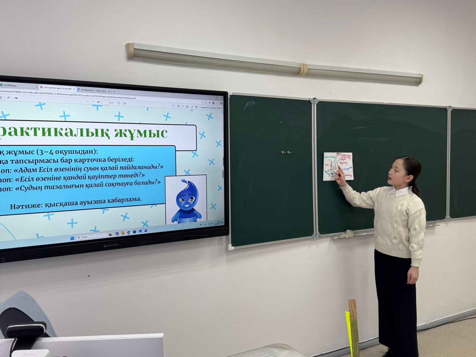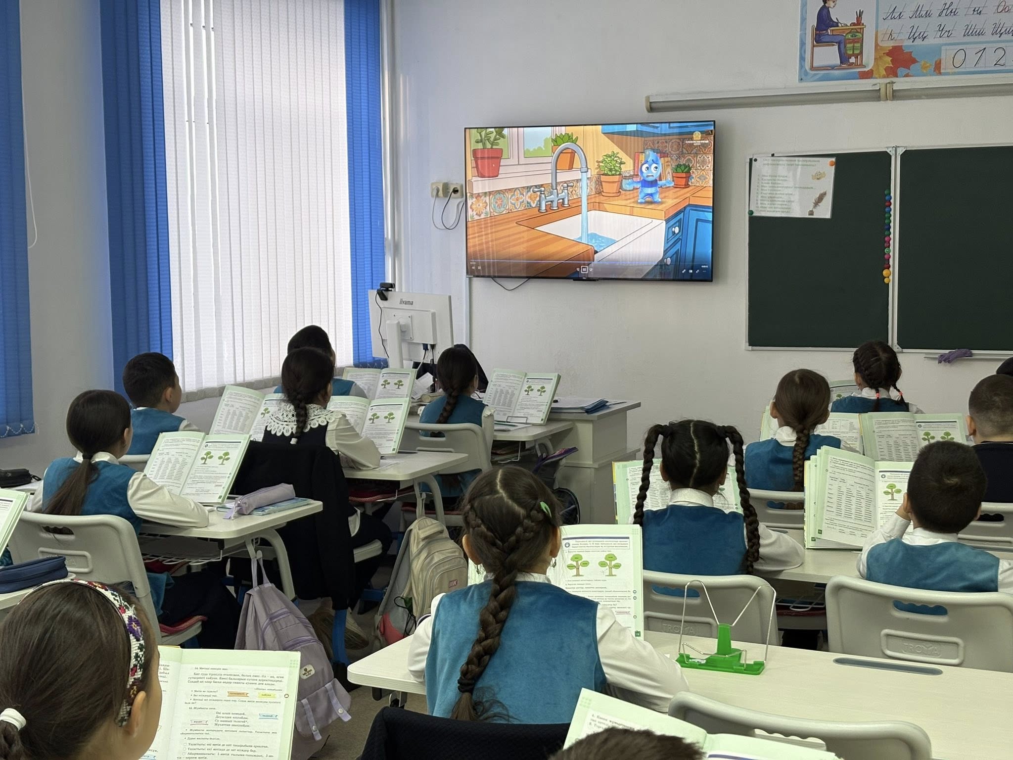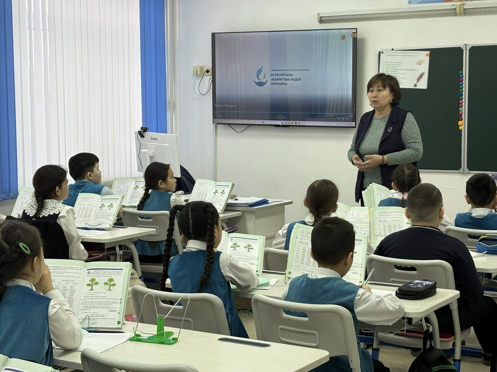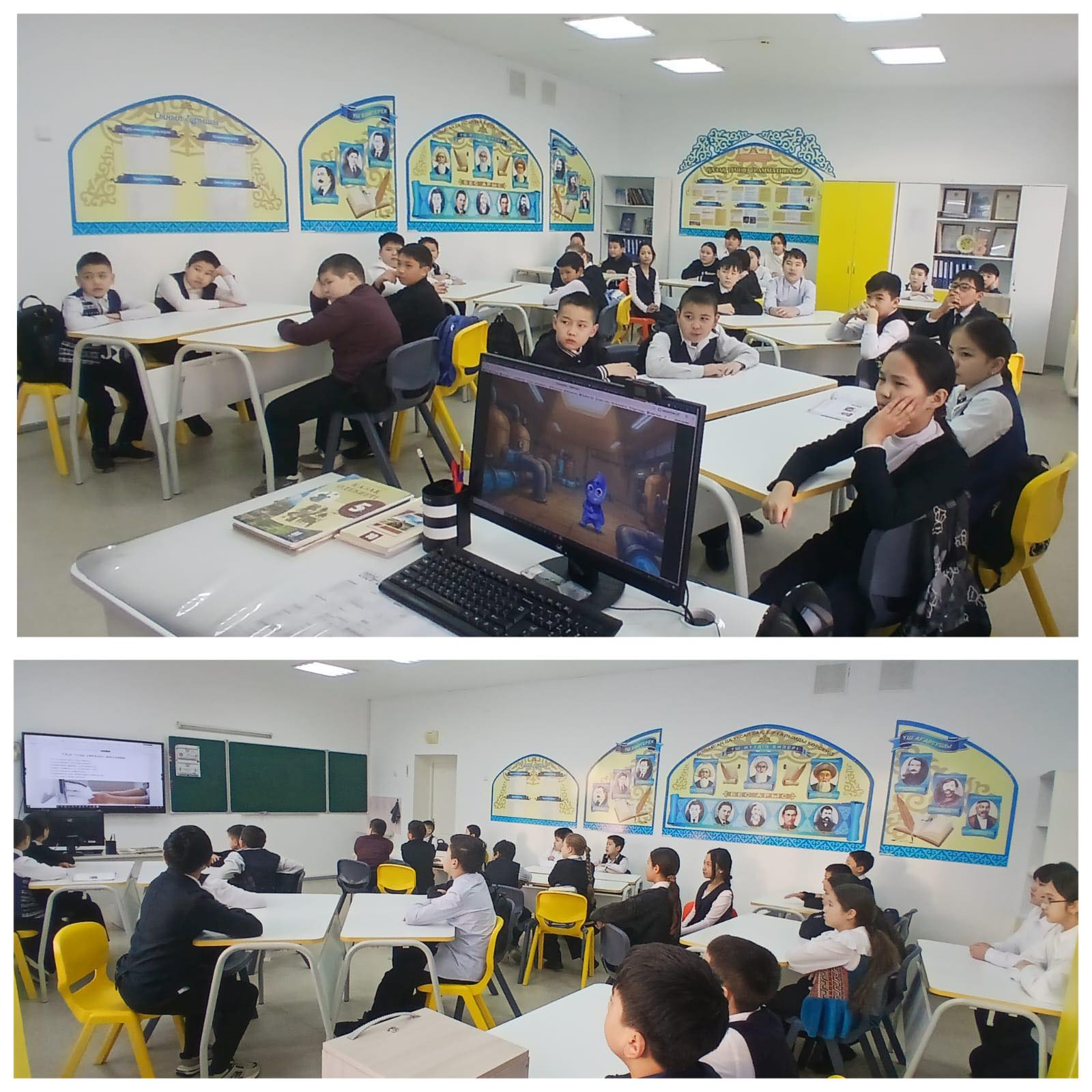 Эко-сағат барысында оқушылар су ресурстарын үнемді пайдаланудың жолдарымен танысып, суды үнемдеудің маңызы мен оның қоршаған ортаны сақтаудағы рөлі туралы мәлімет алды.