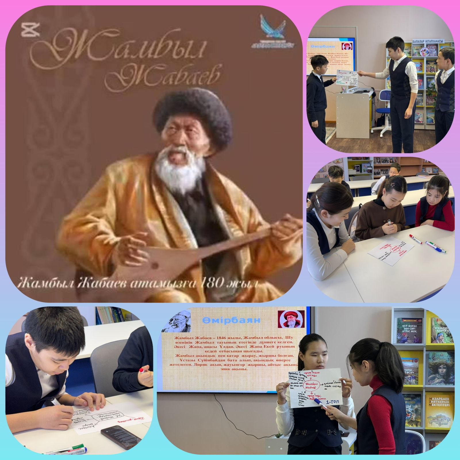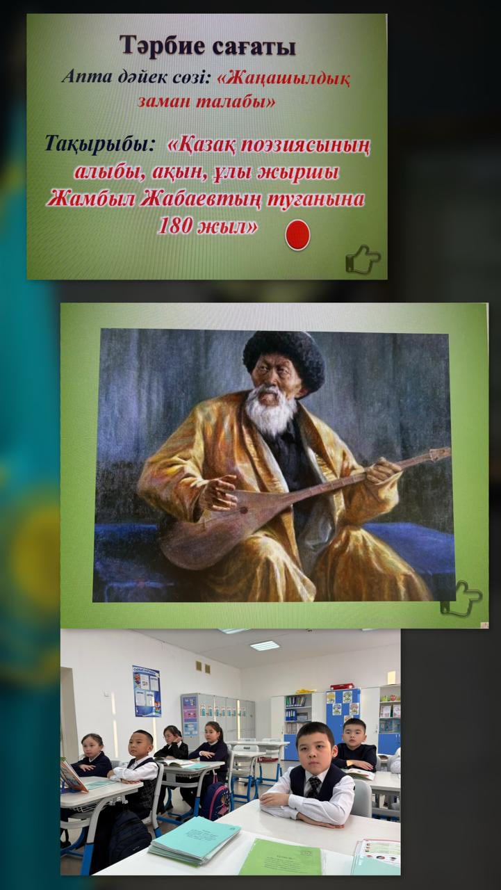 📚Ағымдағы жылдың 25 ақпан күні ұлы ақын, жыр алыбы, қазақ поэзиясының классигі Жамбыл Жабаевтың (1846–1945) туғанына 180 жыл толуына орай сынып сағаттары өткізілді.