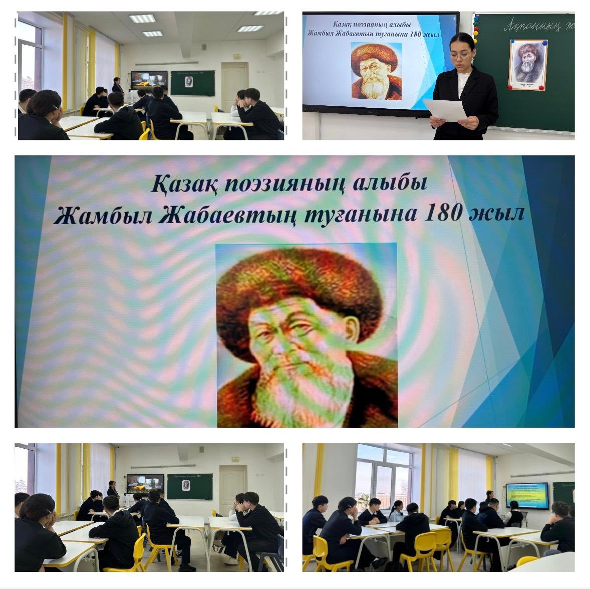 Сынып сағаты барысында оқушылар Жамбыл Жабаевтың өмірі мен шығармашылық жолымен танысып, оның өлеңдері мен жырлары арқылы ұлттық рух пен адамгершілік құндылықтардың маңызын түсінді.