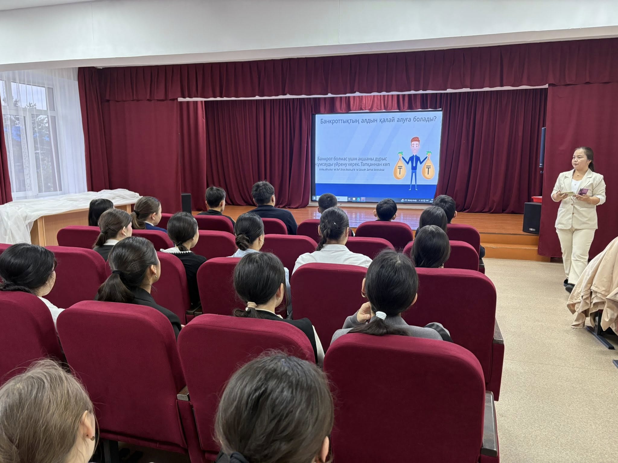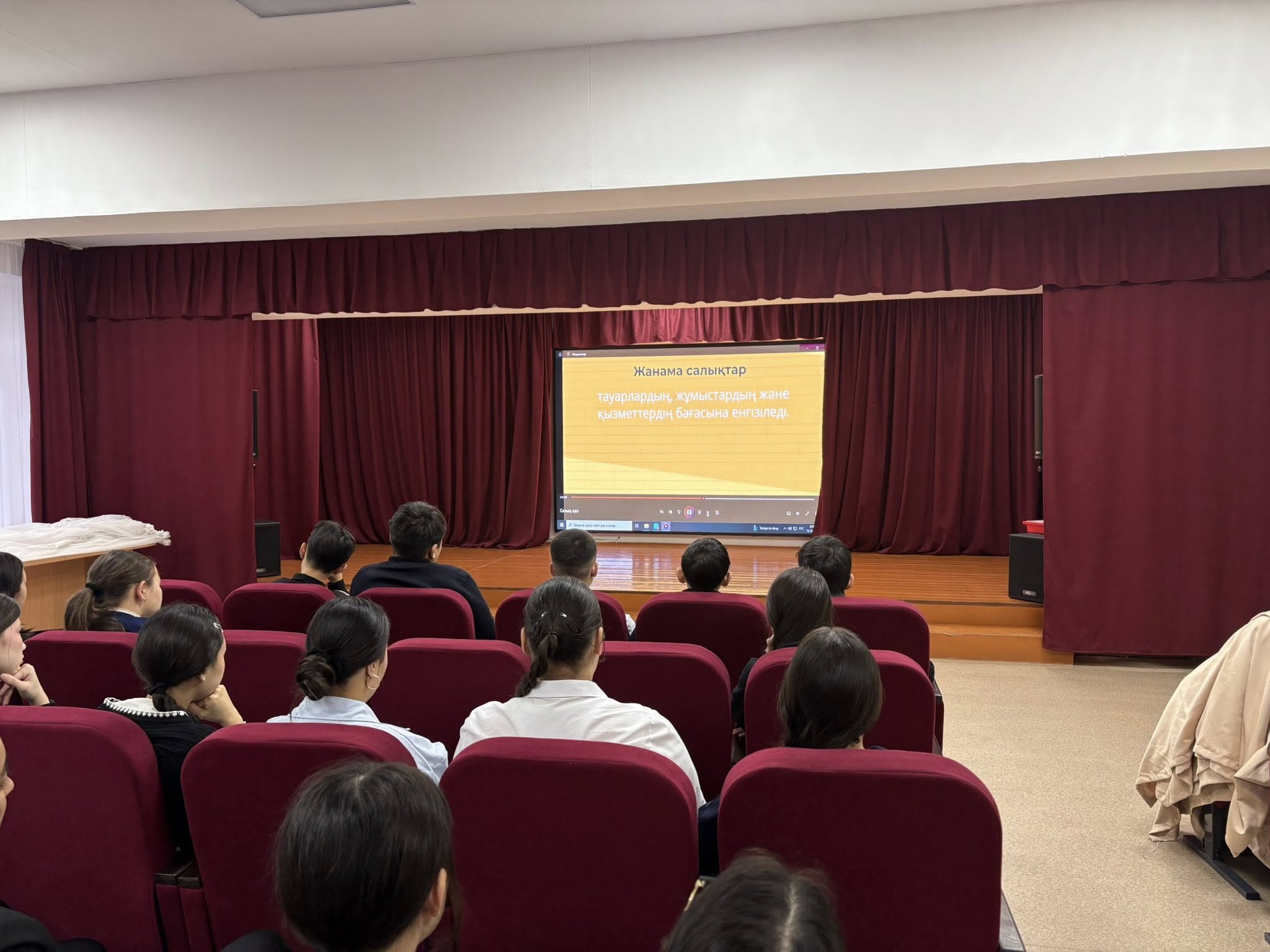 Жамбыл ауданының салық басқармасының қызметкерлері оқышыларға «Салық және оның түрлері» атты бейнеролик көрсетті. Бейнероликте салықтың мемлекет бюджетіне түсетін табыс көзі екендігі, оның түрлері мен маңызы туралы нақты мысалдар келтірілді. Оқушылар бейнероликті қызығушылықпен қарап, кейін сұрақтарға жауап беріп, өз ойларын ортаға салды.