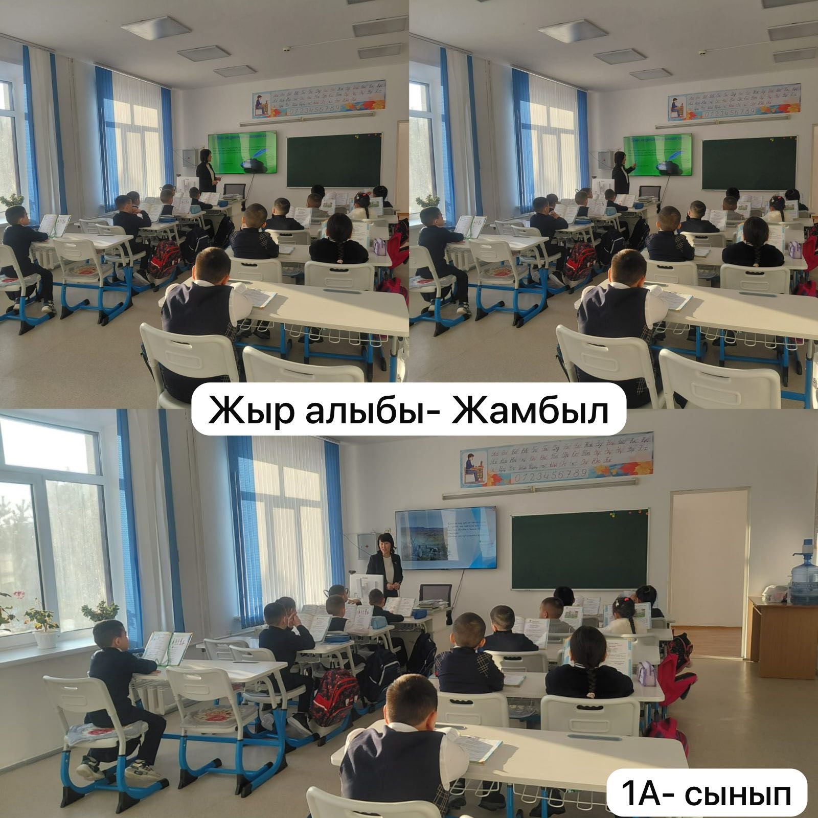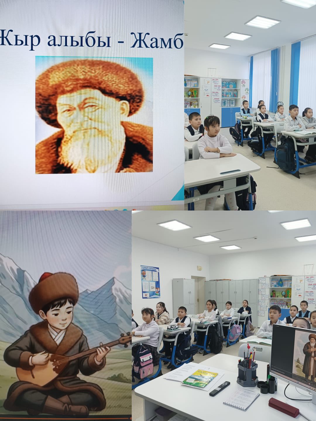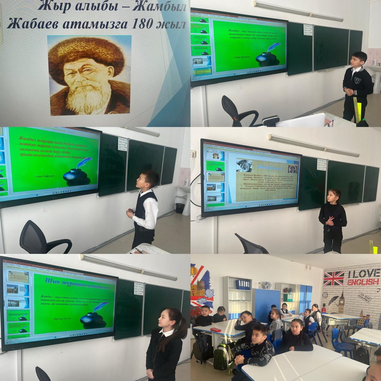 Сынып сағаты барысында оқушылар Жамбыл Жабаевтың өмірі мен шығармашылық жолымен танысып, оның өлеңдері мен жырлары арқылы ұлттық рух пен адамгершілік құндылықтардың маңызын түсінді.