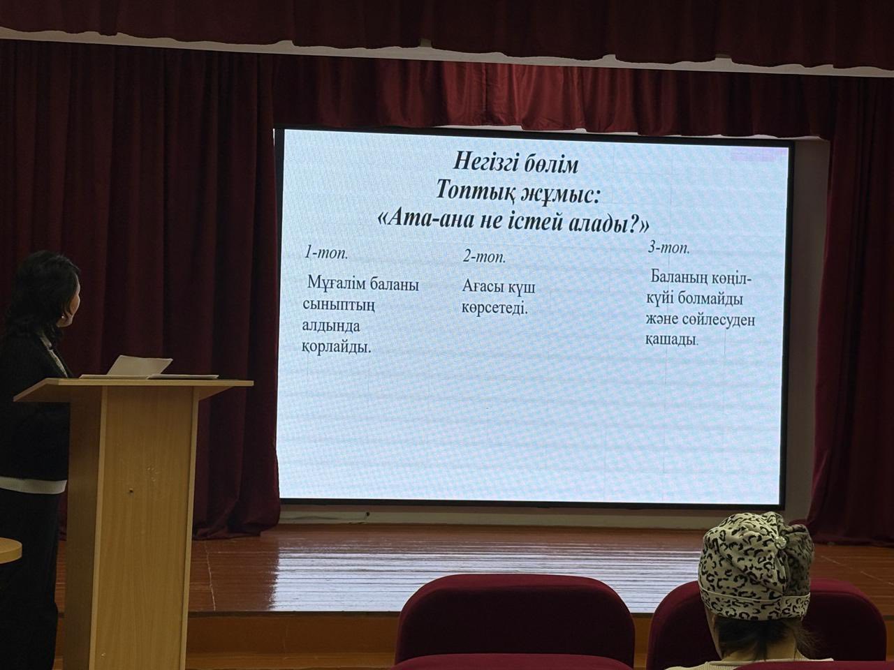 Мектебімізде 1-4 СЫНЫП ОҚУШЫЛАРЫНЫҢ АТА-АНАСЫНА АРНАЛҒАН “Жеке қауіпсіздік және баланы зорлық-зомбылықтан қорғау” тақырыбында ата-аналардың қатысуымен сабақ ұйымдастырылды.
